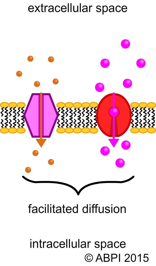 • Facilitated diffusion: diffusion that takes place down a concentration gradient through pores made by proteins that are integral to the structure of the membrane. Each channel is specific to the transport of a particular molecule or ion. These pores may be always present, or they may be gated, which means they can be open or shut depending on the environmental conditions.