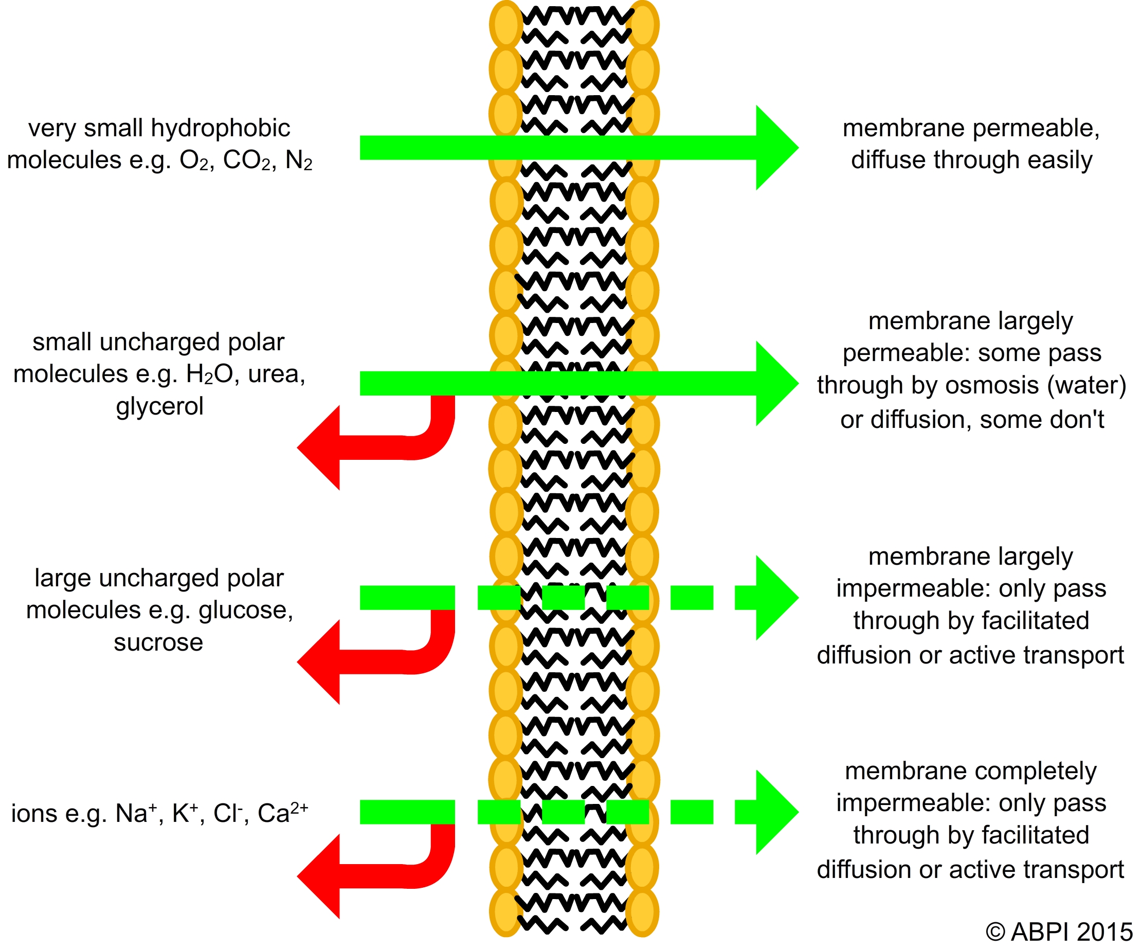 Everything that moves into and out of the cell has to pass through the cell membrane. Cell membranes are partially permeable. This means some substances pass through the membrane relatively easily but others cannot move through it without the input of energy from ATP. The properties of molecules affect how easily they are transported.