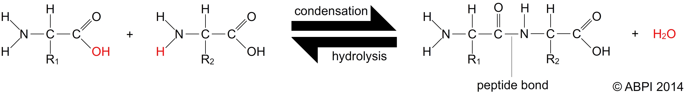 Amino acids are joined in a reaction between the amino group of one amino acid and the carboxyl group of another. This is a condensation reaction which results in a bond known as a peptide bond (or peptide link). Two amino acids joined form a dipeptide. As more and more amino acids are joined into the chain it becomes a polypeptide chain, which may contain hundreds or even thousands of amino acids. A protein is a polypeptide chain which is folded or coiled or associated with other polypeptide chains.