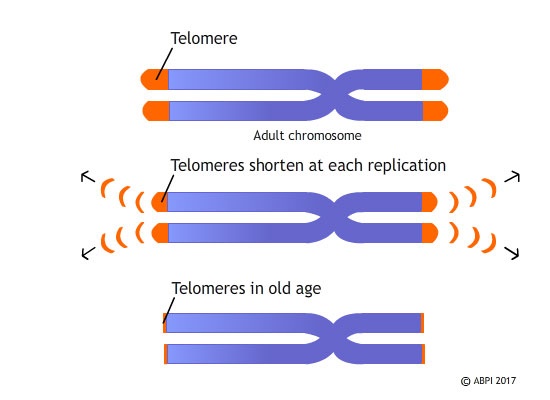 As you age, your DNA is replicated each time your cells divide. The full length of the chromosome is replicated but the primer at the very end of the section-copied strand can’t be correctly joined up to the rest of the strand, so it is degraded and the DNA is shortened. This generally isn’t a problem because the section at the end of a DNA strand, called a telomere, doesn’t contain any genes. Over the many cell divisions that take throughout your lifetime, however, the telomere can shorten so much it disappears altogether and so sections of DNA containing important genes are lost. Telomere shortening is thought to be linked to ageing; once the telomeres are lost altogether, important genetic material is damaged and this might be the reason for some of the severe health problems that are seen in older people.