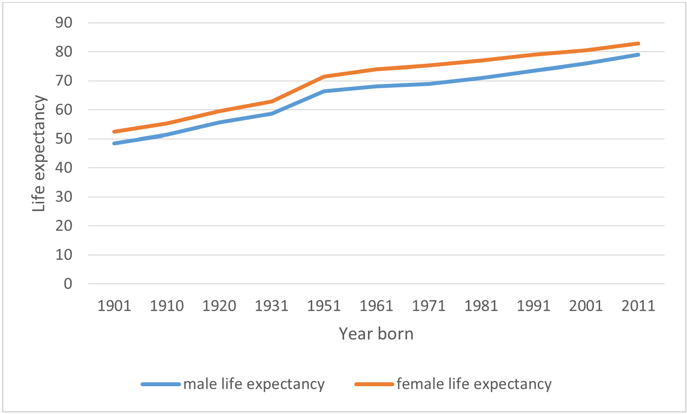 In 1901, the average life expectancy in the United Kingdom was 47 years. By the year 2000 it had risen to 77 years and for someone born in the UK in 2015 it is 81 years. New medicines, childhood immunisations, improved air quality and better public hygiene has contributed to this 72% increase in the life expectancy.