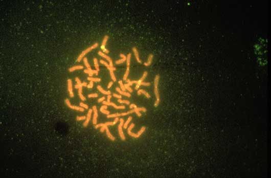 Human chromosomes stained with a fluorescent dye. The sequence of bases A, G, C and T hold the genetic information.