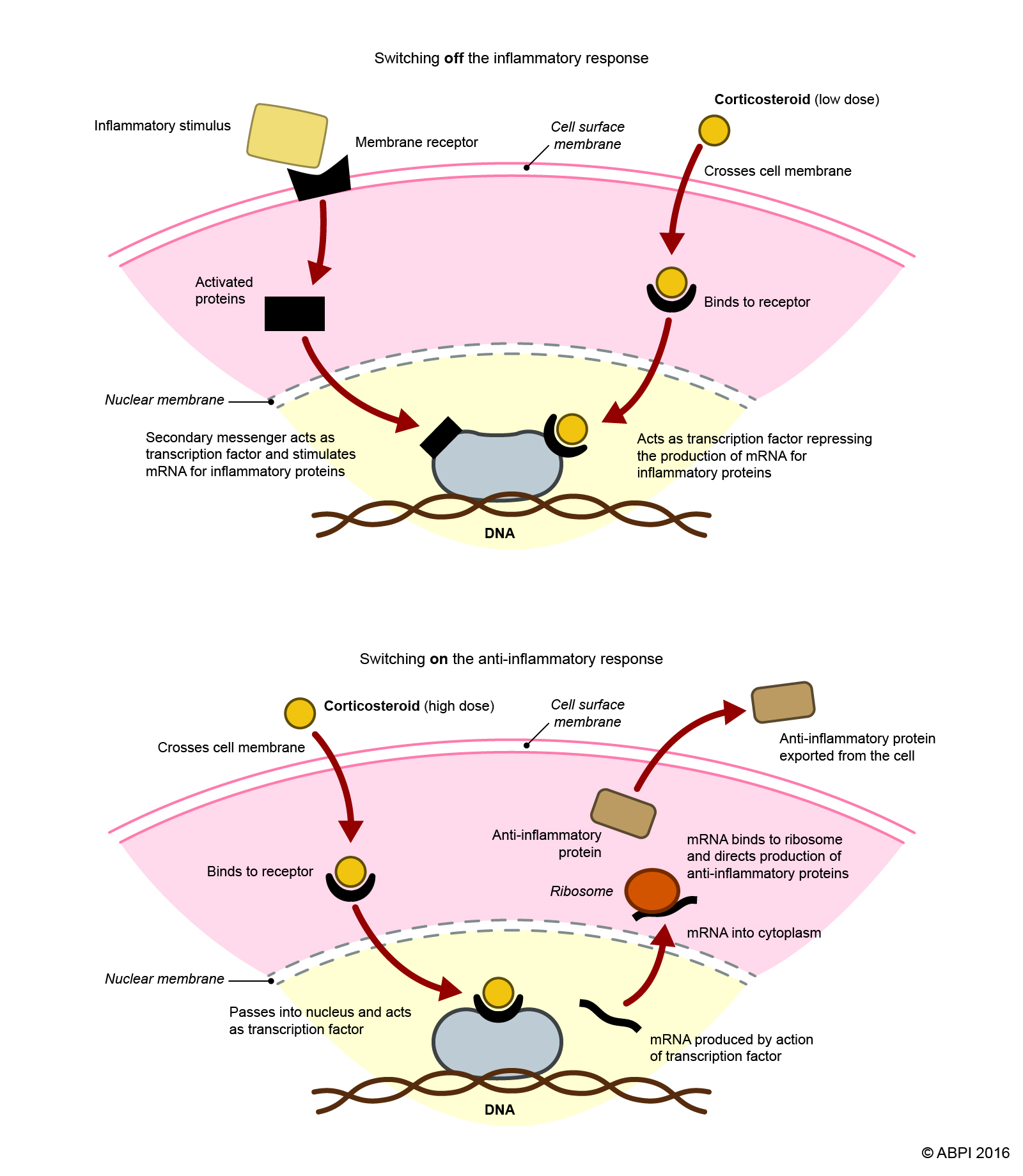 Gene switching as a result of corticosteroid medication may both switch off genes associated with the inflammatory response