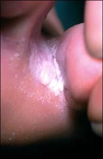 Dermatophyte fungal infection causing athlete's foot, or tinea pedis, between toes.