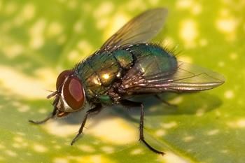 Houseflies are everywhere – and wherever they go, bacteria and viruses go too. The average lifespan of an adult housefly is around one month. During that time they feed and breed on garbage, sewage, rotting food and other sources of filth. They can only take in liquid food, so they vomit up digestive juices onto their food and suck up the liquid which is produced by the digestive enzymes. They suck up lots of bacteria and viruses too. The pathogens which cover their food are carried away on the mouthparts, feet and other body parts of the fly. Then, through their vomit, faeces and contaminated external body parts, the flies transfer bacteria and viruses to human and animal food or directly onto our skin.